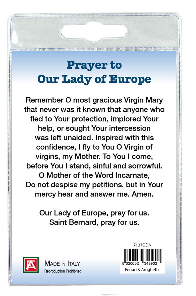 Medaglia di Nostra Signora dell'Europa di cm 2,5 in metallo nichelato con laccio. L'immagine della Madonna è ricoperta da uno strato di resina trasparente. La medagia si presenta confezionata in un blister con all'interno un cartoncino con immagine della Madonna e con una preghiera in inglese sul retro del cartoncino stesso.