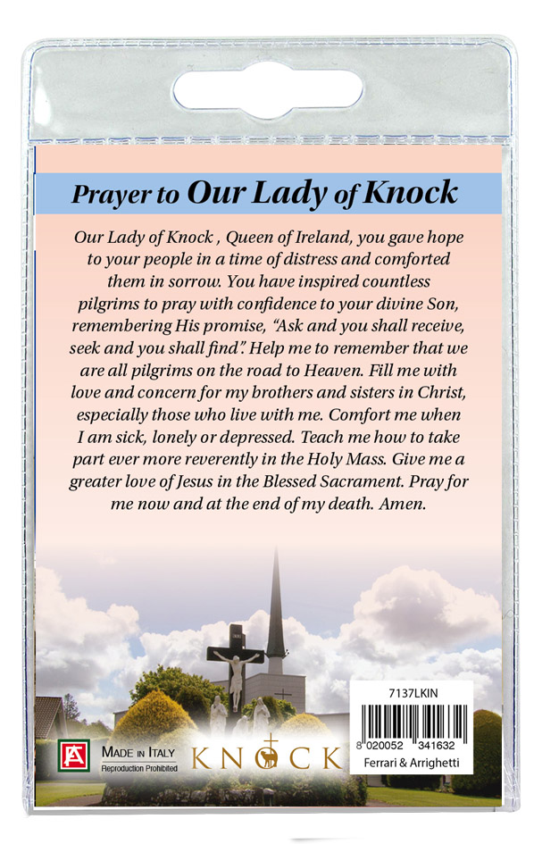Medaglia Our Lady of Knock di cm 2,5 in metallo nichelato con laccio. L'immagine della Madonna è ricoperta da uno strato di resina trasparente. La medagia si presenta confezionata in un blister con all'interno un cartoncino con immagine della Madonna e con una preghiera in inglese sul retro del cartoncino stesso.