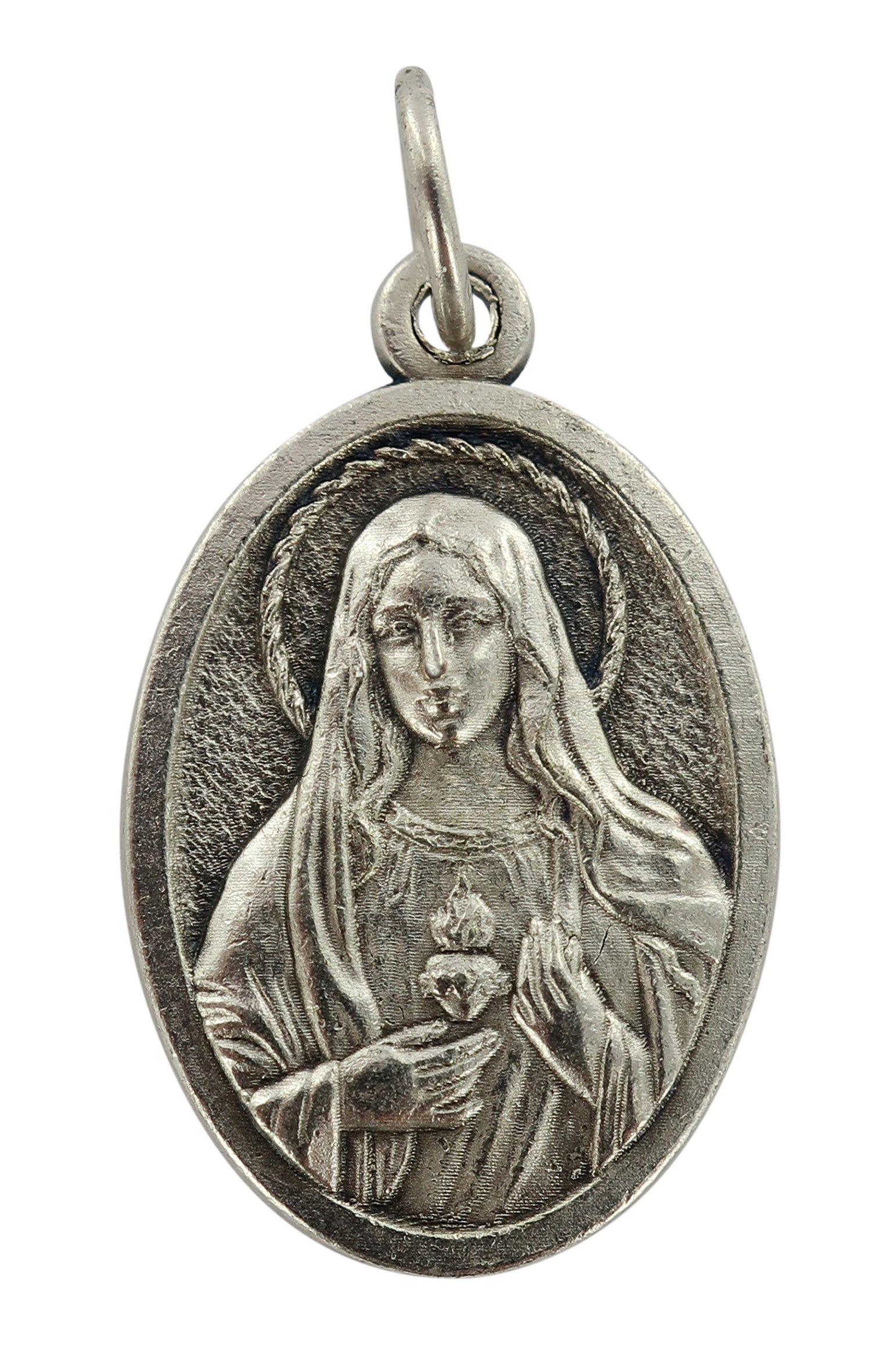 Medaglia ovale in metallo ossidato raffigurante su una faccia il Sacro Cuore di Gesù e sull'altra il Cuore Immacolato di Maria.