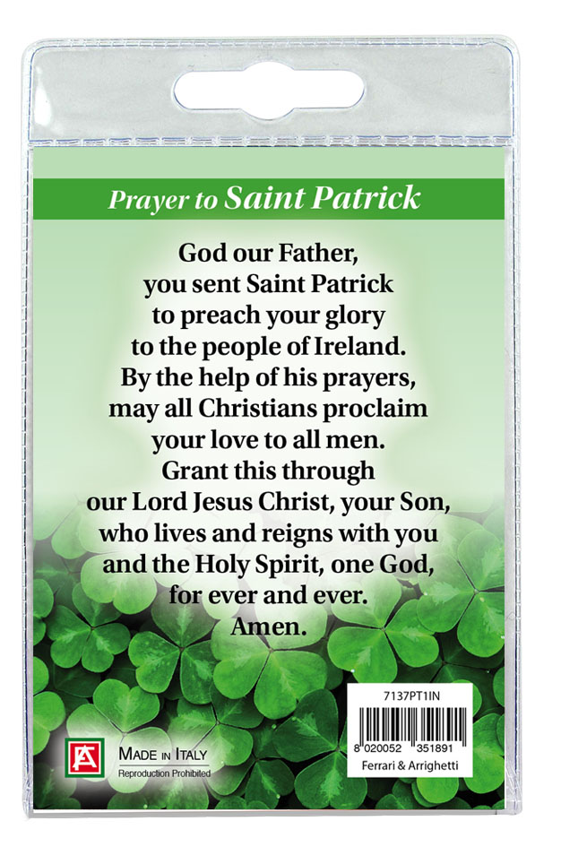 Medaglia di Saint Patrick di cm 2,5 in metallo nichelato con laccio. L'immagine del Santo è ricoperta da uno strato di resina trasparente. La medaglia si presenta confezionata in un blister con all'interno un cartoncino con immagine di Saint Patrick e con una preghiera in inglese sul retro del cartoncino stesso.