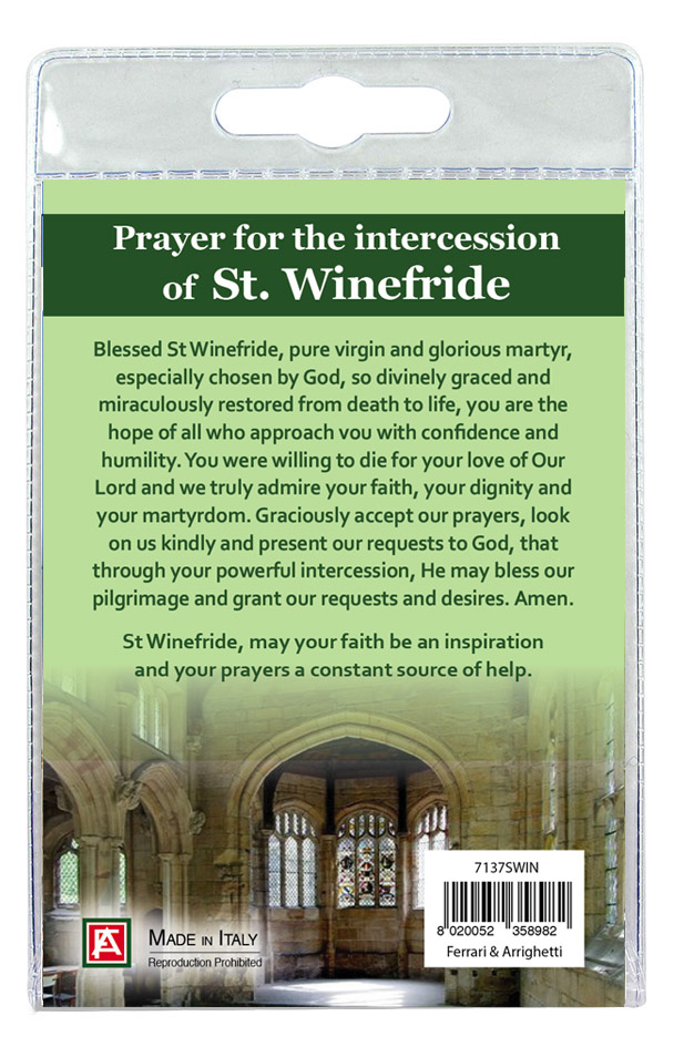 Medaglia Saint Winefride di cm 2,5 in metallo nichelato con laccio. L'immagine della Santa è ricoperta da uno strato di resina trasparente. La medaglia si presenta confezionata in un blister con all'interno un cartoncino con immagine di Saint Winefride e con una preghiera in inglese sul retro del cartoncino stesso.