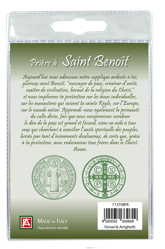 Medaglia di San Benedetto di cm 2,5 in metallo nichelato con laccio. L'immagine del Santo è ricoperta da uno strato di resina trasparente. La medagia si presenta confezionata in un blister con all'interno un cartoncino con immagine del Santo e con una preghiera in francese sul retro del cartoncino stesso.