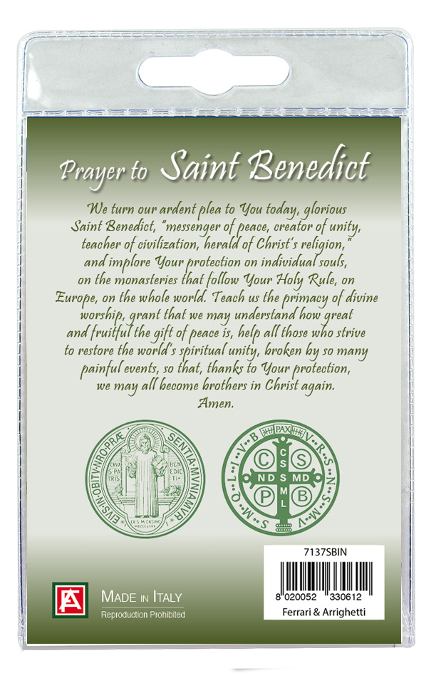 Medaglia di San Benedetto di cm 2,5 in metallo nichelato con laccio. L'immagine del Santo è ricoperta da uno strato di resina trasparente. La medagia si presenta confezionata in un blister con all'interno un cartoncino con immagine del Santo e con una preghiera in inglese sul retro del cartoncino stesso.