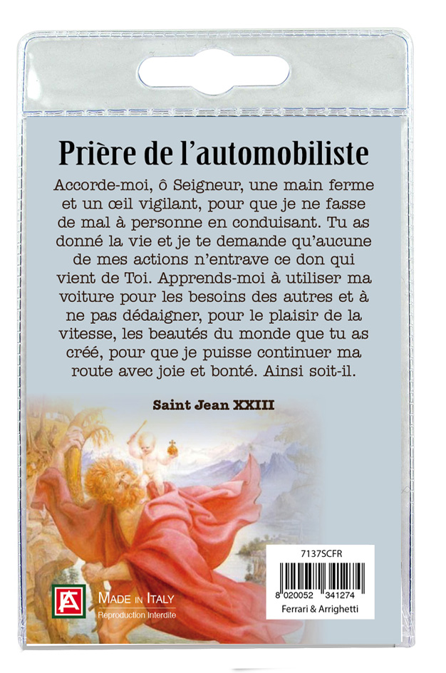 Medaglia di San Cristoforo di cm 2,5 in metallo nichelato con laccio. L'immagine del Santo è ricoperta da uno strato di resina trasparente. La medagia si presenta confezionata in un blister con all'interno un cartoncino con immagine del Santo e con una preghiera in francese sul retro del cartoncino stesso.