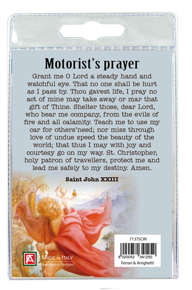 Medaglia di San Cristoforo di cm 2,5 in metallo nichelato con laccio. L'immagine del Santo è ricoperta da uno strato di resina trasparente. La medagia si presenta confezionata in un blister con all'interno un cartoncino con immagine del Santo e con una preghiera in inglese sul retro del cartoncino stesso.