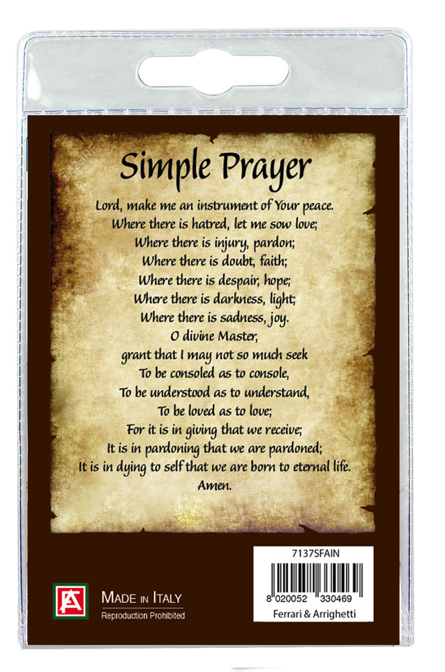 La medaglia, in metallo nichelato, ha un cordino in stoffa e su di essa vi è la resina raffigurante San Francesco. La medaglia misura 2,5 centimetri e verrà consegnata in un blister. All'interno del blister c'è un cartoncino rappresentante San Francesco, e sul retro vi è stampata una preghiera dedicata a lui.