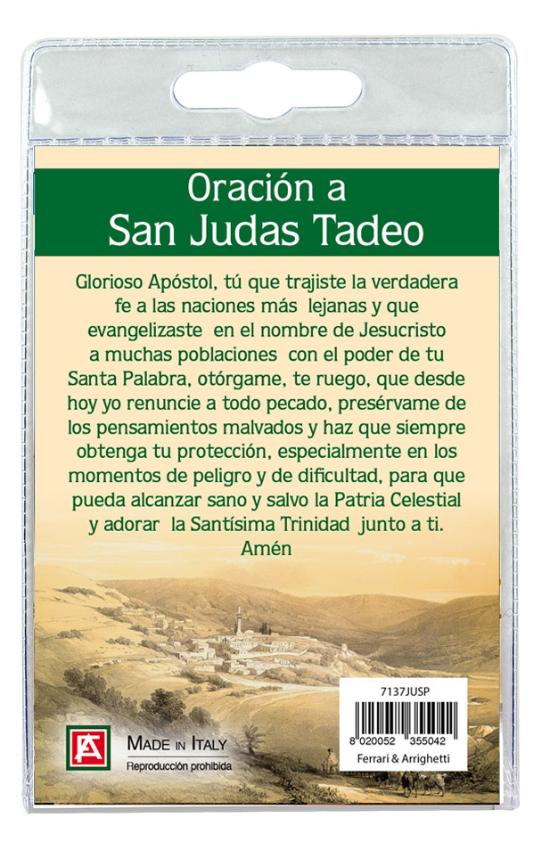 Medaglia San Giuda Taddeo di cm 2,5 in metallo nichelato con laccio. L'immagine del Santo è ricoperta da uno strato di resina trasparente. La medaglia si presenta confezionata in un blister con all'interno un cartoncino con immagine del Santo e con una preghiera in spagnolo sul retro del cartoncino stesso.