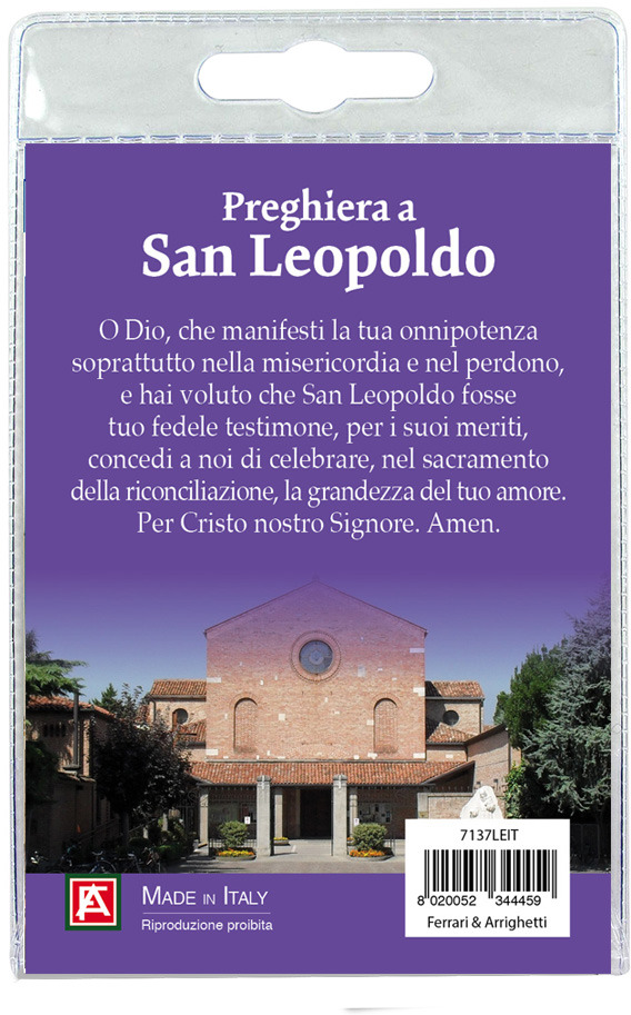 Medaglia di San Leopoldo di cm 2,5 in metallo nichelato con laccio. L'immagine del Santo è ricoperta da uno strato di resina trasparente. La medagia si presenta confezionata in un blister con all'interno un cartoncino con immagine del Santo e con una preghiera in italiano sul retro del cartoncino stesso.