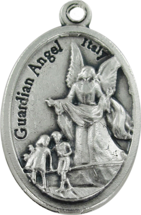 Medaglia ovale in metallo ossidato raffigurante su una faccia San Michele e sull'altra L'Angelo Custode di misura 2,5 x 1,5 cm.