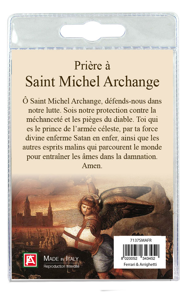 Medaglia di San Michele di cm 2,5 in metallo nichelato con laccio. L'immagine del Santo è ricoperta da uno strato di resina trasparente. La medagia si presenta confezionata in un blister con all'interno un cartoncino con immagine del Santo e con una preghiera in francese sul retro del cartoncino stesso.