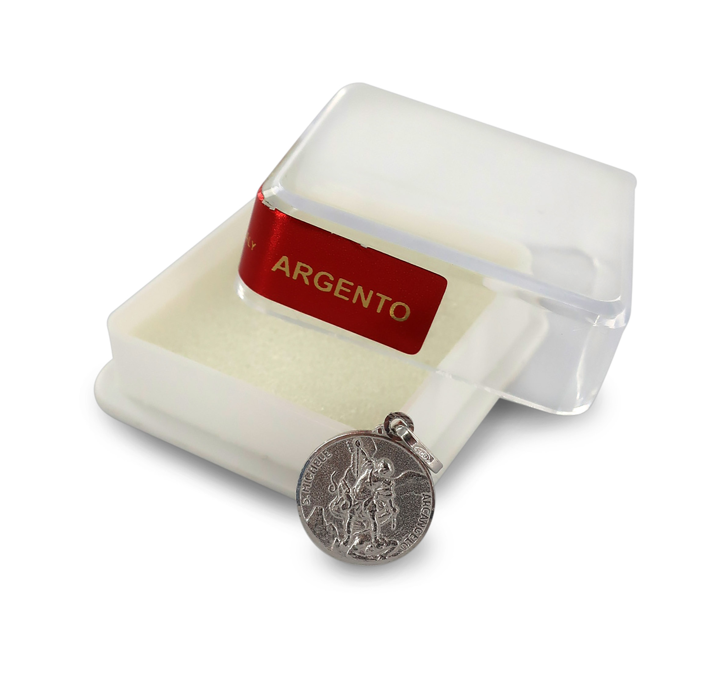 Medaglia tonda con bordo leggermente zigrinato e nell'interno è stampato in rilievo San Michele.