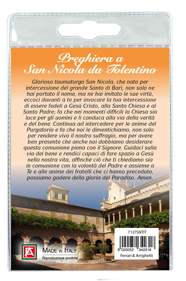 Medaglia di San Nicola da Tolentino di cm 2,5 in metallo nichelato con laccio. L'immagine del Santo è ricoperta da uno strato di resina trasparente. La medagia si presenta confezionata in un blister con all'interno un cartoncino con immagine del Santo e con una preghiera in italiano sul retro del cartoncino stesso.