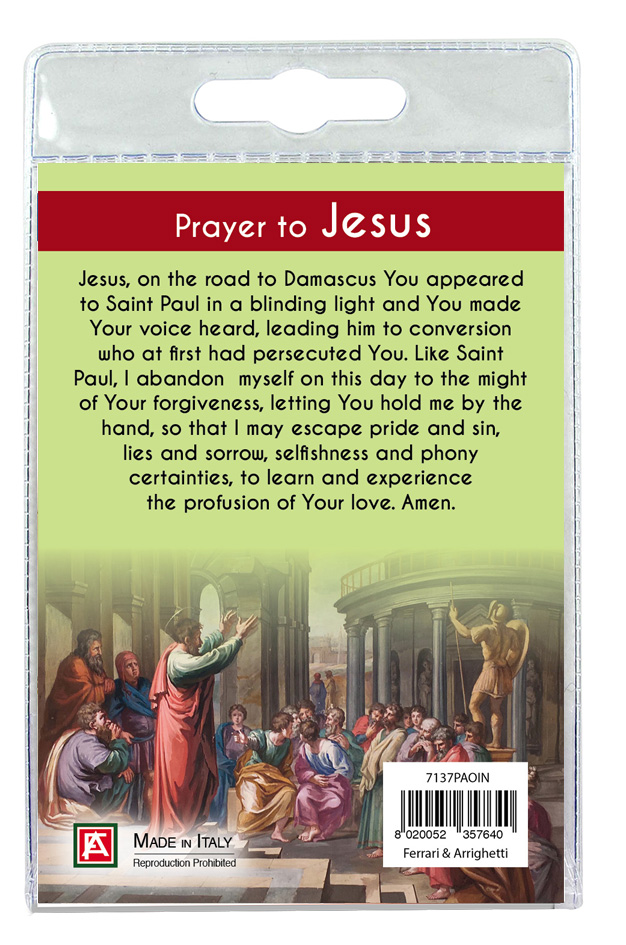 Medaglia San Paolo apostolo di cm 2,5 in metallo nichelato con laccio. L'immagine del Santo è ricoperta da uno strato di resina trasparente. La medaglia si presenta confezionata in un blister con all'interno un cartoncino con immagine di San Paolo apostolo e con una preghiera in inglese sul retro del cartoncino stesso.