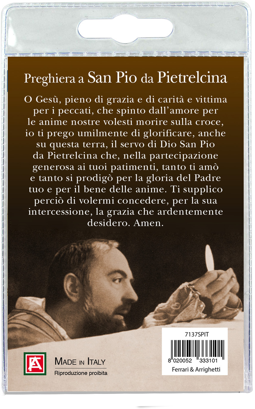 La medaglia, in metallo nichelato, ha un cordino in stoffa e su di essa vi è la resina raffigurante San Pio. La medaglia misura 2,5 centimetri e verrà consegnata in un blister. All'interno del blister c'è un cartoncino rappresentante San Pio, e sul retro vi è stampata una preghiera dedicata a lui.