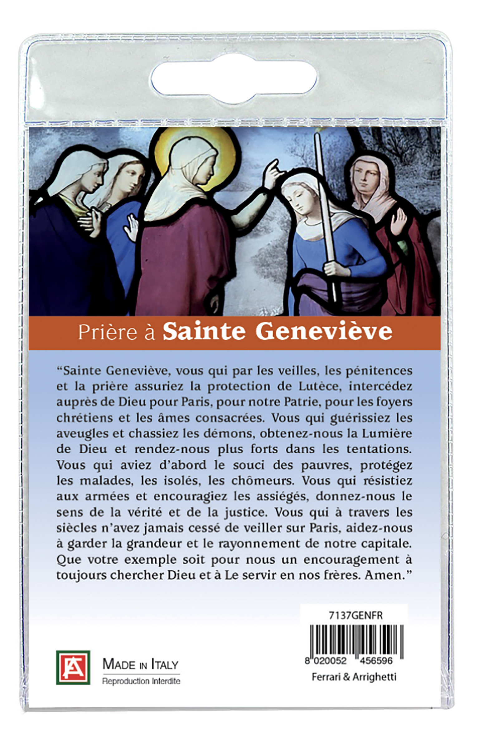 La medaglia, in metallo nichelato, ha un cordino in stoffa e su di essa vi è la resina raffigurante Santa Genoveffa. La medaglia misura 2,5 centimetri e verrà consegnata in un blister. All'interno del blister c'è un cartoncino rappresentante la Santa, e sul retro vi è stampata una preghiera dedicata a Lei.