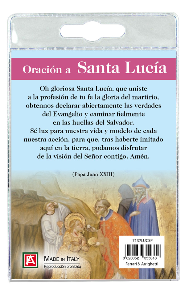Medaglia Santa Lucia di cm 2,5 in metallo nichelato con laccio. L'immagine della Santa è ricoperta da uno strato di resina trasparente. La medaglia si presenta confezionata in un blister con all'interno un cartoncino con immagine di Santa Lucia e con una preghiera in spagnolo sul retro del cartoncino stesso.
