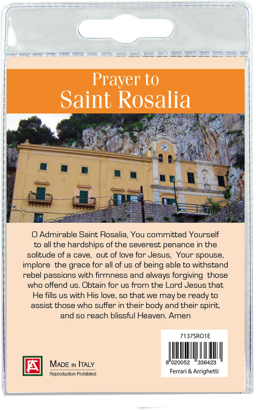 Medaglia Santa Rosalia di cm 2,5 in metallo nichelato con laccio. L'immagine della Santa è ricoperta da uno strato di resina trasparente. La medaglia si presenta confezionata in un blister con all'interno un cartoncino con immagine della Santa e con una preghiera in inglese sul retro del cartoncino stesso.