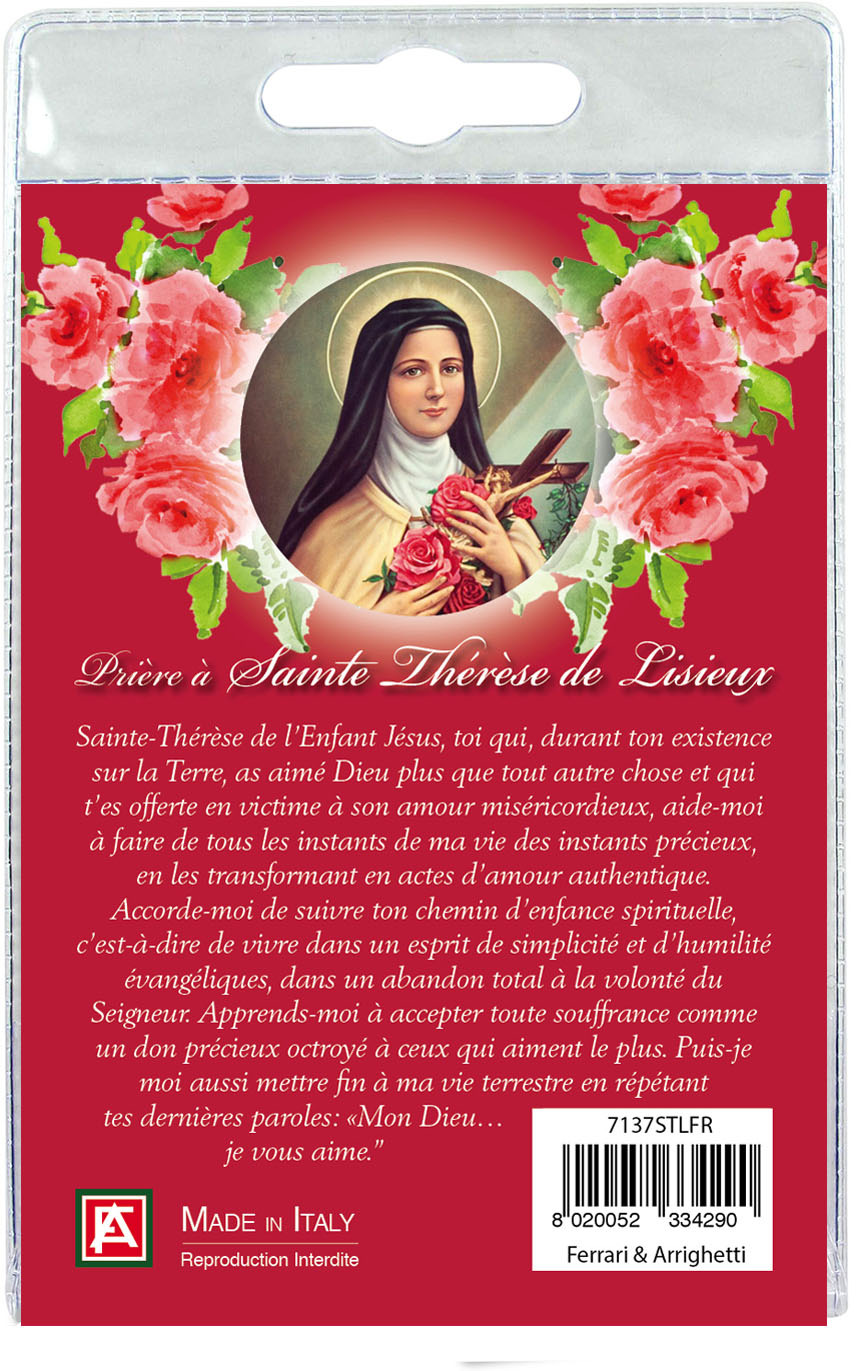 Medaglia Santa Teresa di Lisieux con laccio in blister con preghiera in francese
