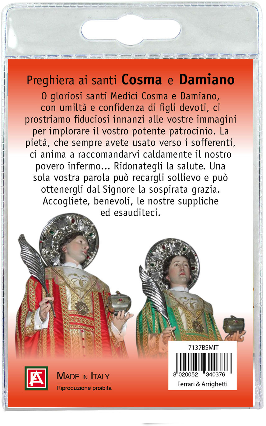 Medaglia dei Santi Medici Cosma e Damiano (a Bitonto) di cm 2,5 in metallo nichelato con laccio. L'immagine dei Santi è ricoperta da uno strato di resina trasparente. La medaglia si presenta confezionata in un blister con all'interno un cartoncino con immagine dei Santi Medici a Bitono e con una preghiera in italiano sul retro del cartoncino stesso. Realizzato in Italia.