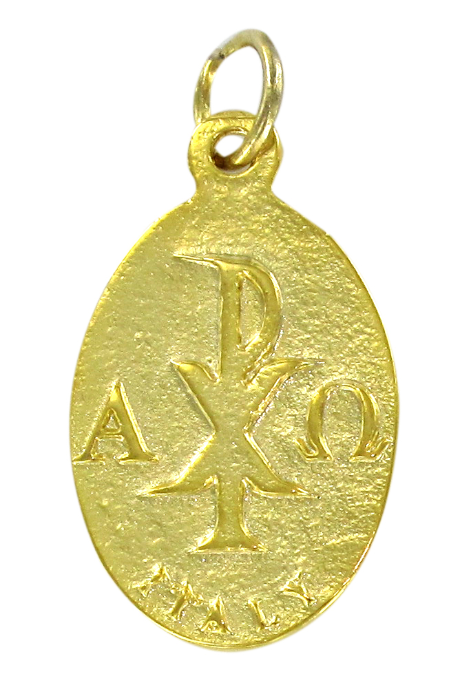 Il metallo è dorato e sullo smalto rosso è applicata la Colomba dello Spirito Santo in metallo nichelato