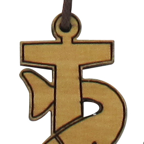 Ciondolo in legno d'ulivo raffigurante l'ancora con il pesce.
