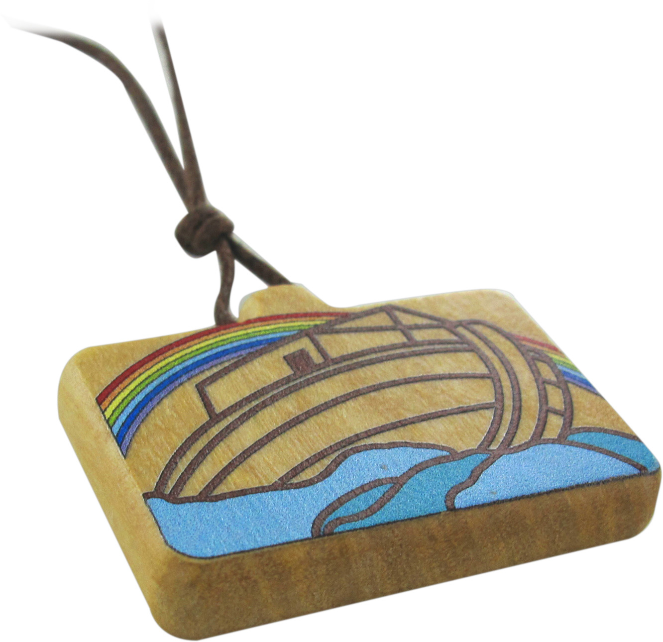 Ciondolo in legno d'ulivo rettangolare raffigurante l'Arca di Noè.