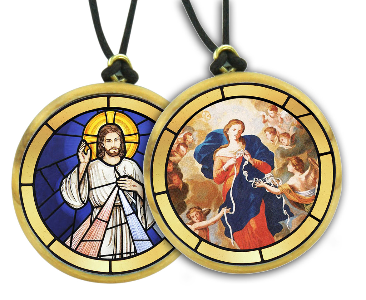 Il ciondolo è costituito da un medaglione tondo in ulivo con, da un lato Maria che scioglie i nodi serigrafata e dall'altro Gesù Misericordioso.