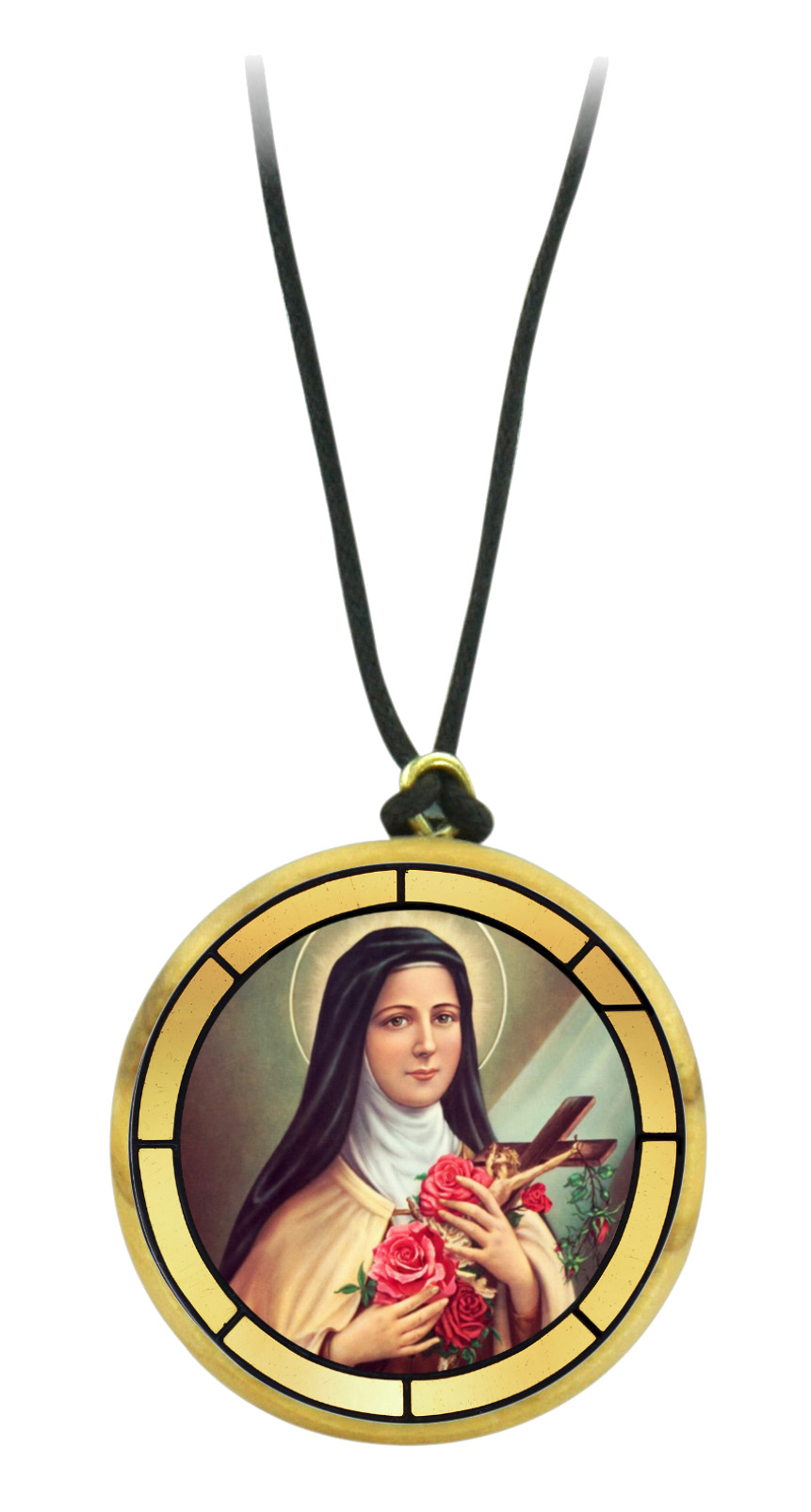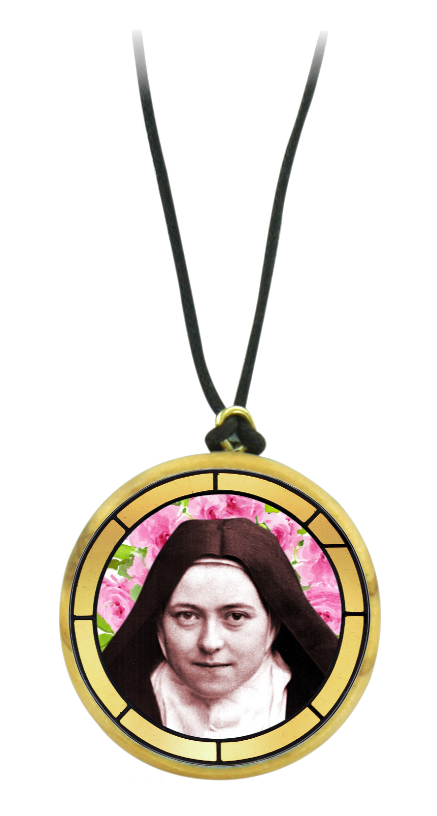 Il ciondolo è costituito da un medaglione tondo in ulivo condue immagini serigrafate di Santa Teresa di Lisieux.