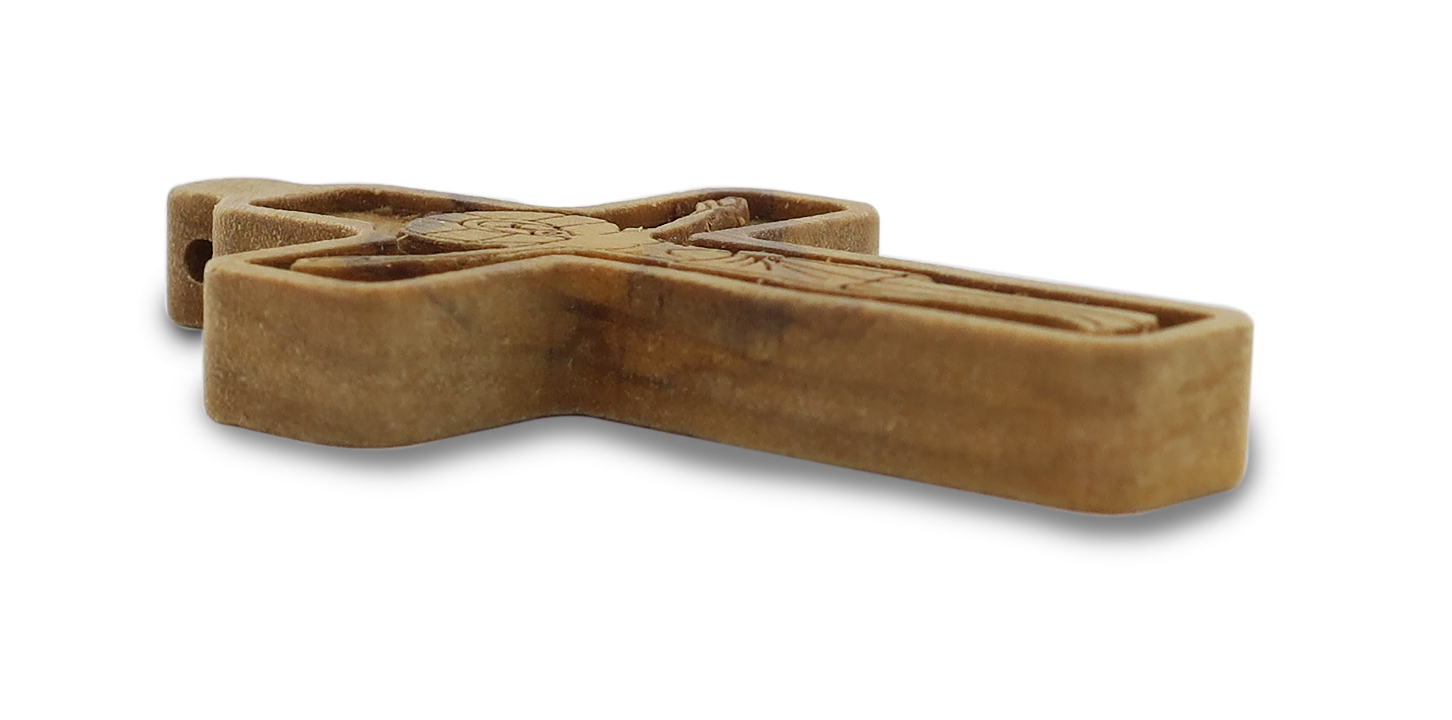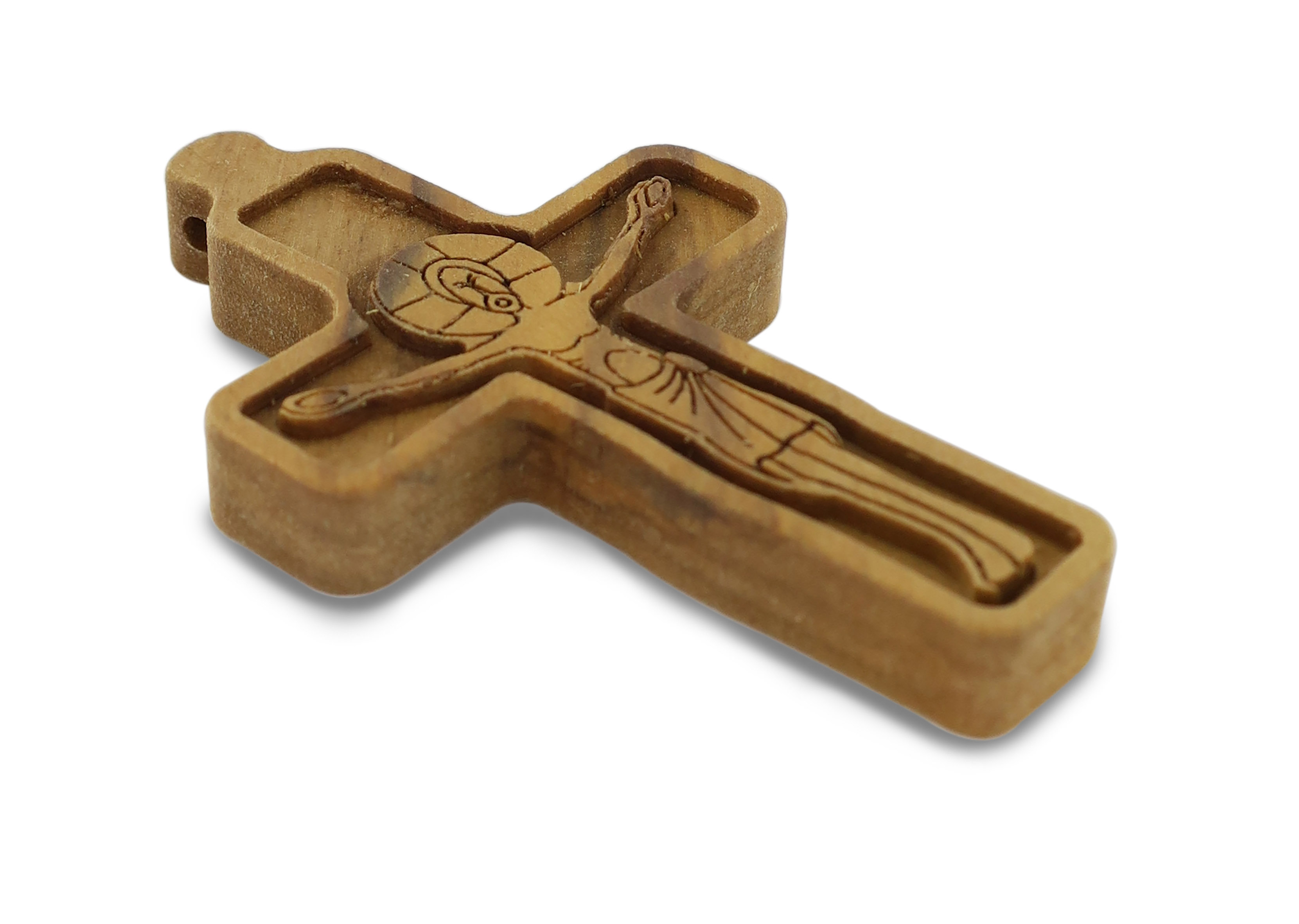 Croce in legno d'ulivo con il corpo di Cristo in rilievo (Altezza di 6 cm).