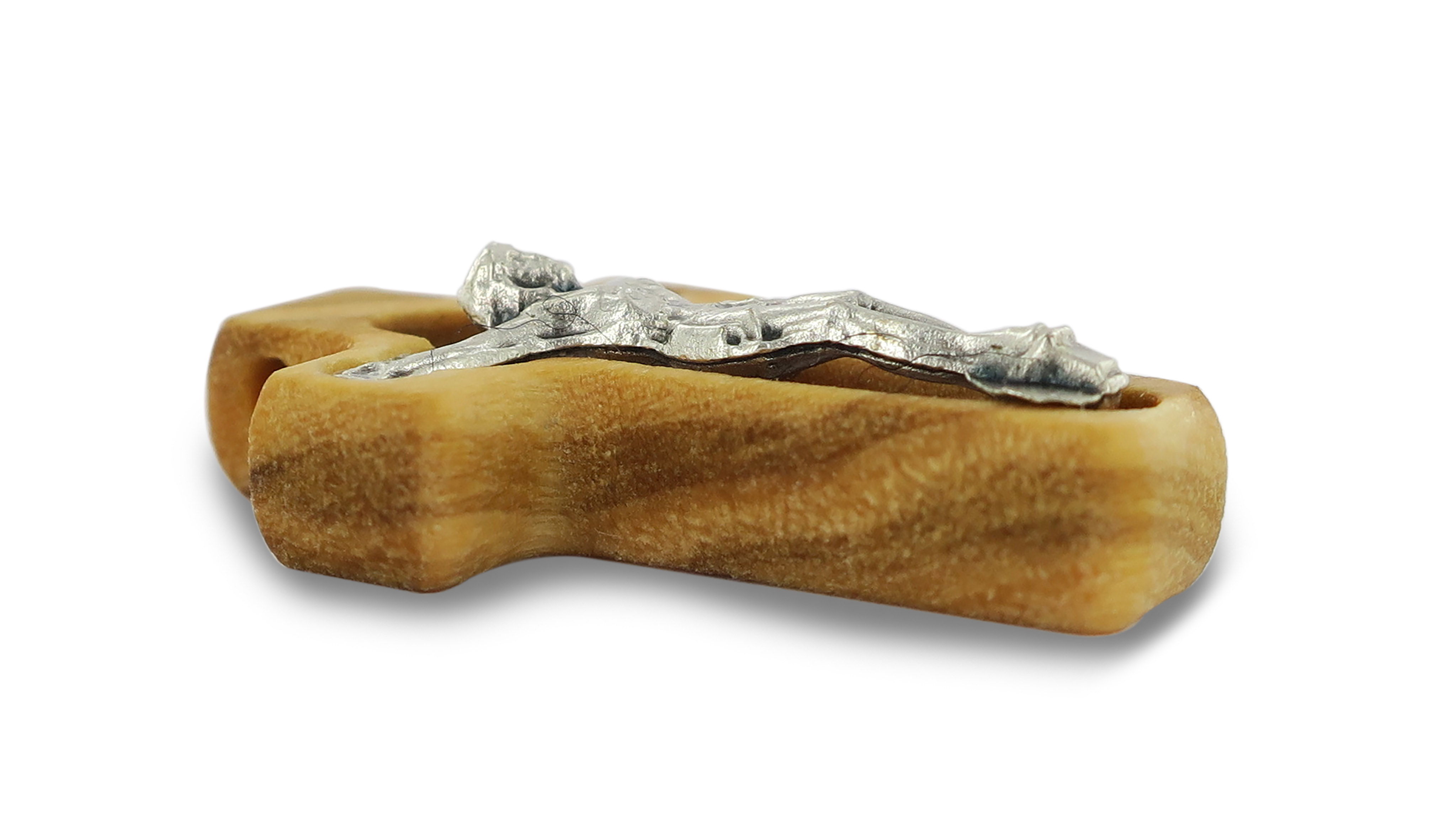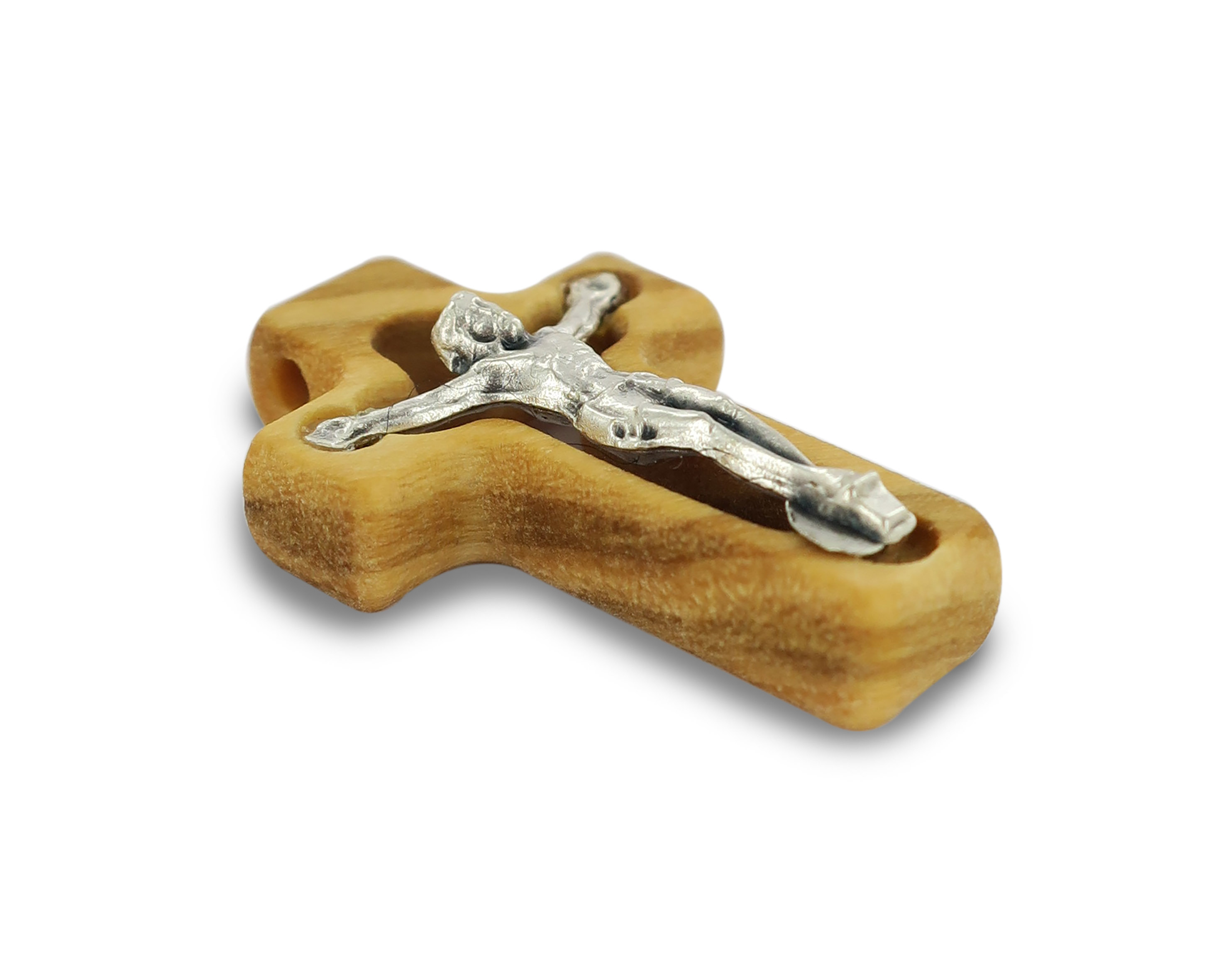 La crocietta si presenta in legno d'ulivo forato con il Cristo riportatto in metallo argentato.