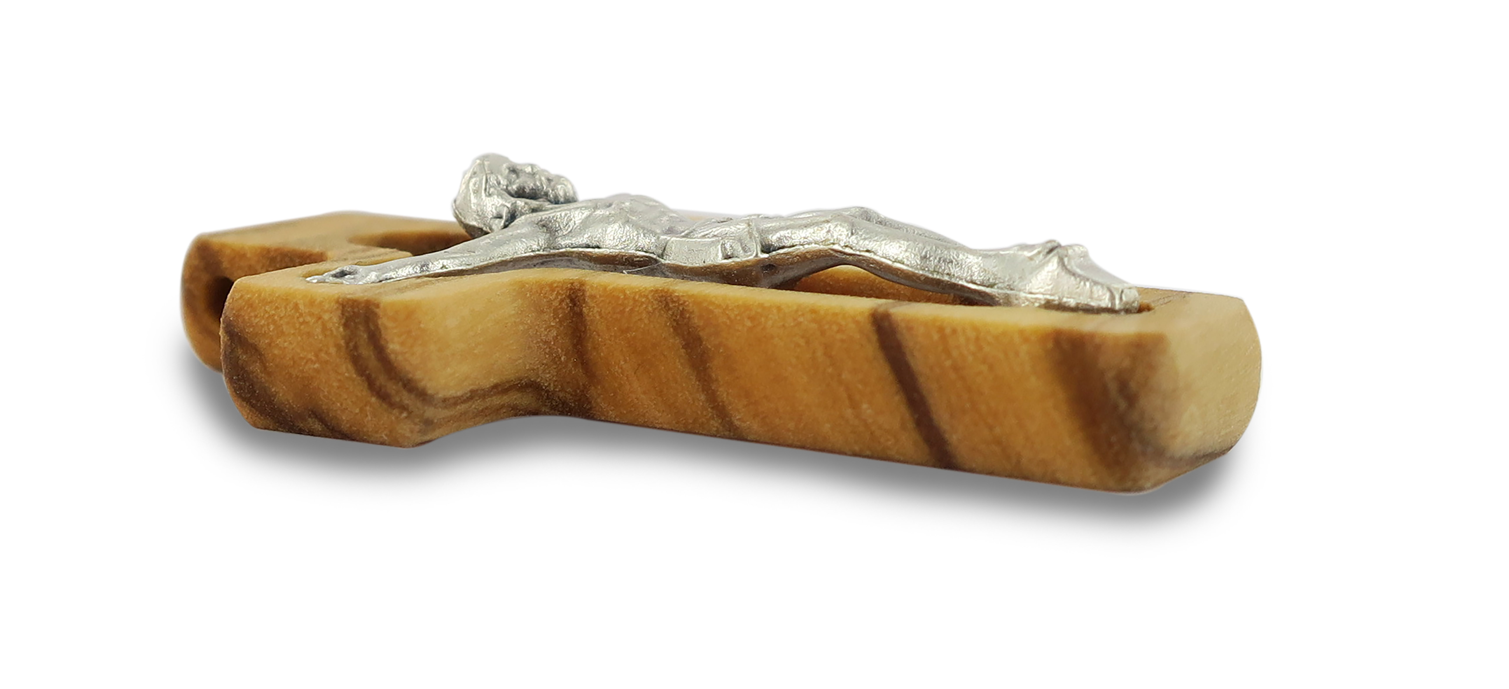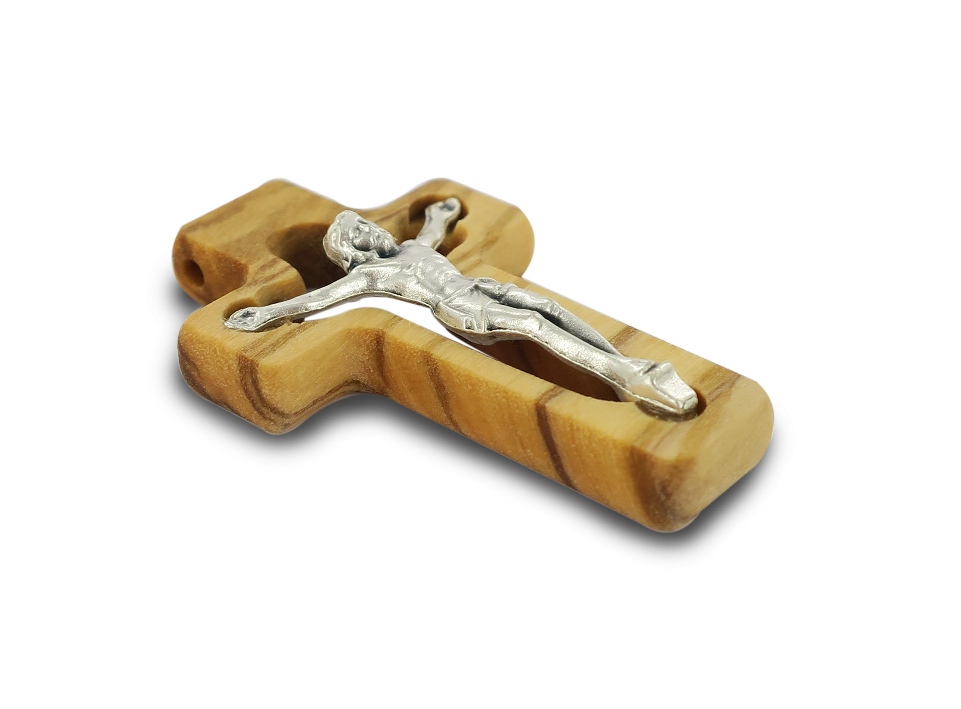 La crocietta di cm 4 si presenta in ulivo forato con il Cristo riportatto in metallo argentato.
