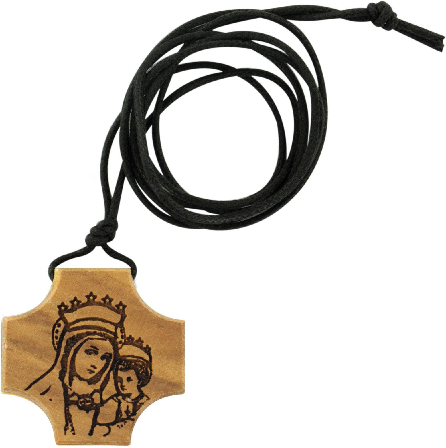 Croce in ulivo con incisone della Madonna col Bambino.