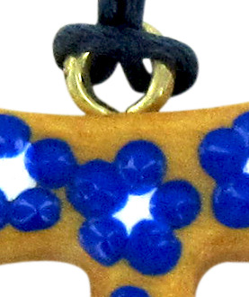 Fornito con cordoncino in stoffa blu con tre nodi francescani, simbolo delle tre regole franciscane: povertà, castità e obbedienza.