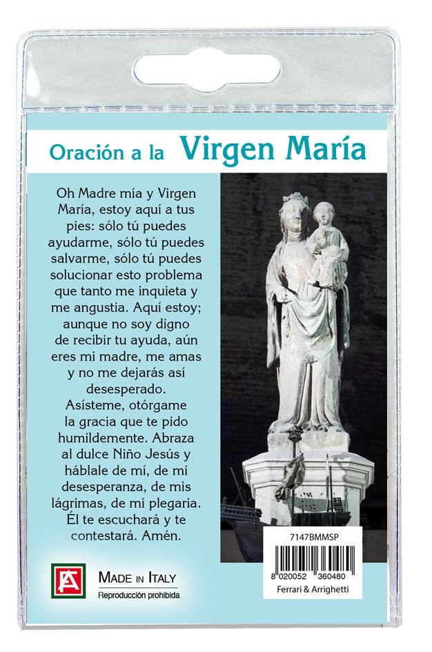 Sul retro del cartoncino vi è stampata una preghiera dedicata alla Vergine Maria.