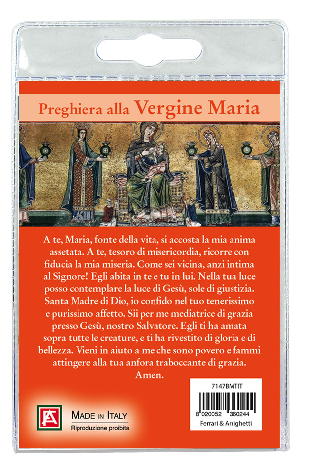 Sul retro del cartoncino vi è stampata una preghiera dedicata alla Vergina Maria.