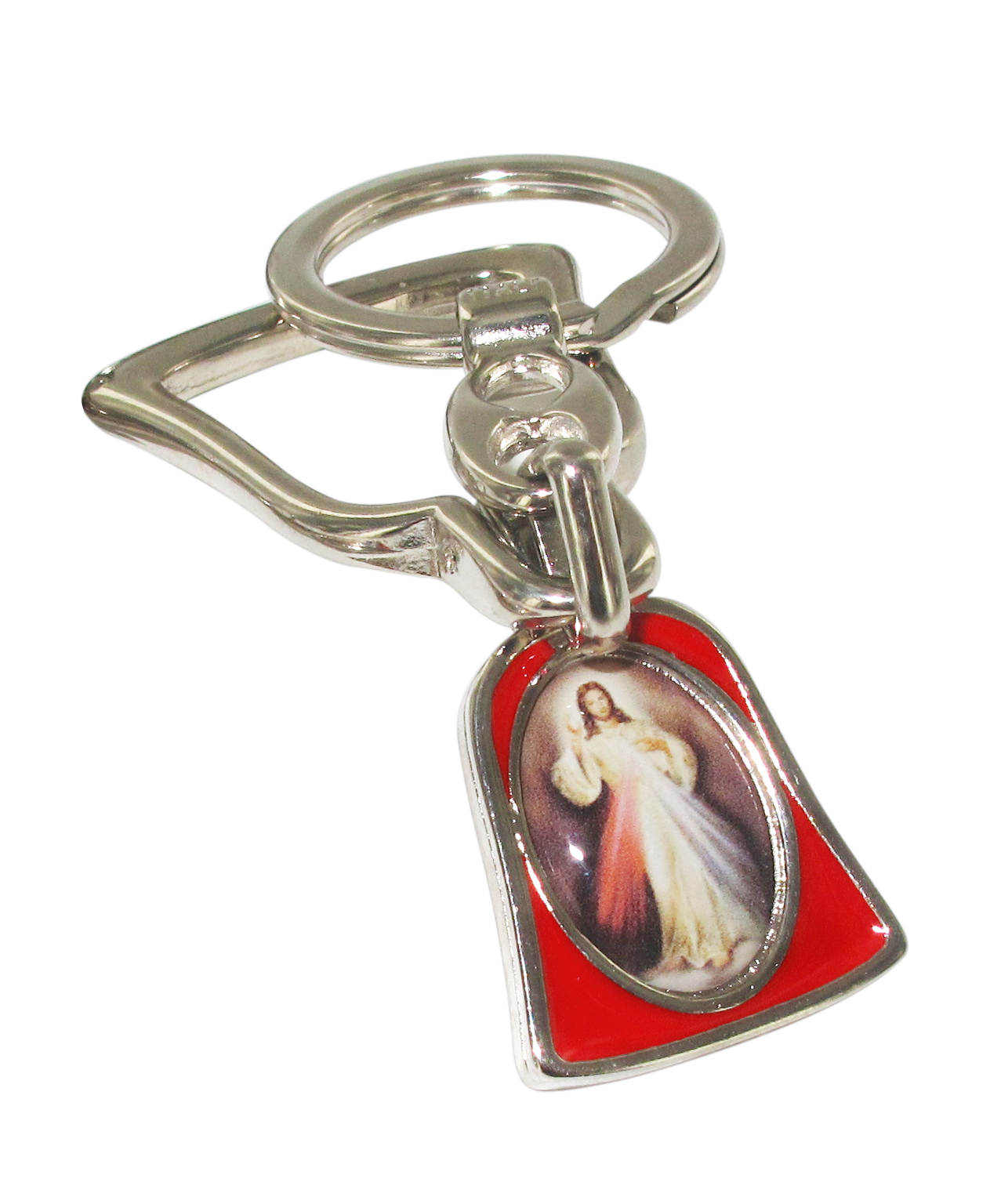Portachiavi a forma di campana con incastonata una medaglietta con doppia immagine: in una faccia è