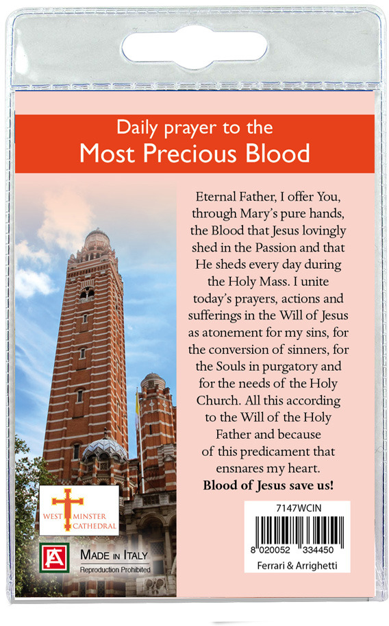 Il blister si presenta con all'interno un cartoncino rappresentante la Cattedrale di Westminster con una preghiera dedicata al Preziosissimo Sangue di Gesù Cristo.