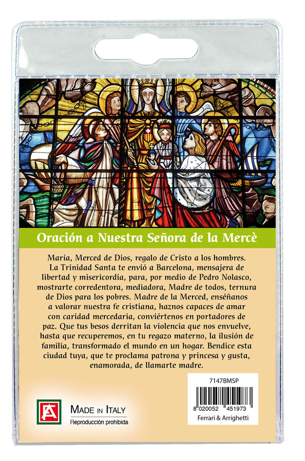 Il blister si presenta con all'interno un cartoncino rappresentante la Basilica de la Mercè con una preghiera a lei dedicata (in SPAGNOLO).