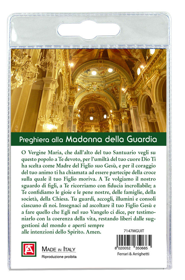 Il blister si presenta con all'interno un cartoncino, rappresentante la Madonna ed il Santuario.