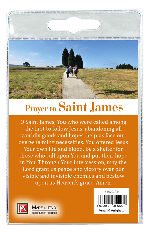 Il blister si presenta con all'interno un cartoncino, rappresentante San Giacomo il maggiore. Sul retro del cartoncino vi è stampata l'immagine di San Giacomo il maggiore. Il portachiave è in metallo nichelato, all'interno del quale vi è l'immagine resinata. Uno smalto messo a mano attornia l'immagine.