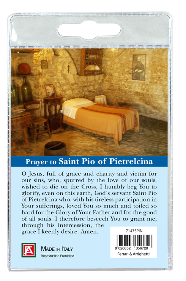 Il blister si presenta con all'interno un cartoncino, rappresentante San Pio.