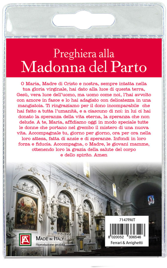 Il blister si presenta con all'interno un cartoncino, rappresentante la Madonna del Parto.