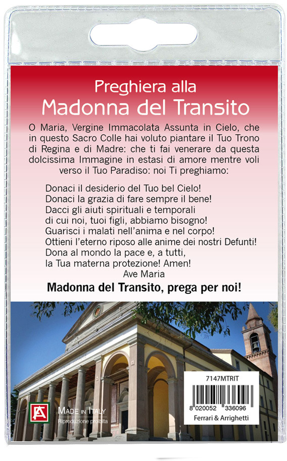 Il blister si presenta con all'interno un cartoncino, rappresentante la Madonna del Transito. Sul retro del cartoncino vi è stampata l'immagine del santuario.