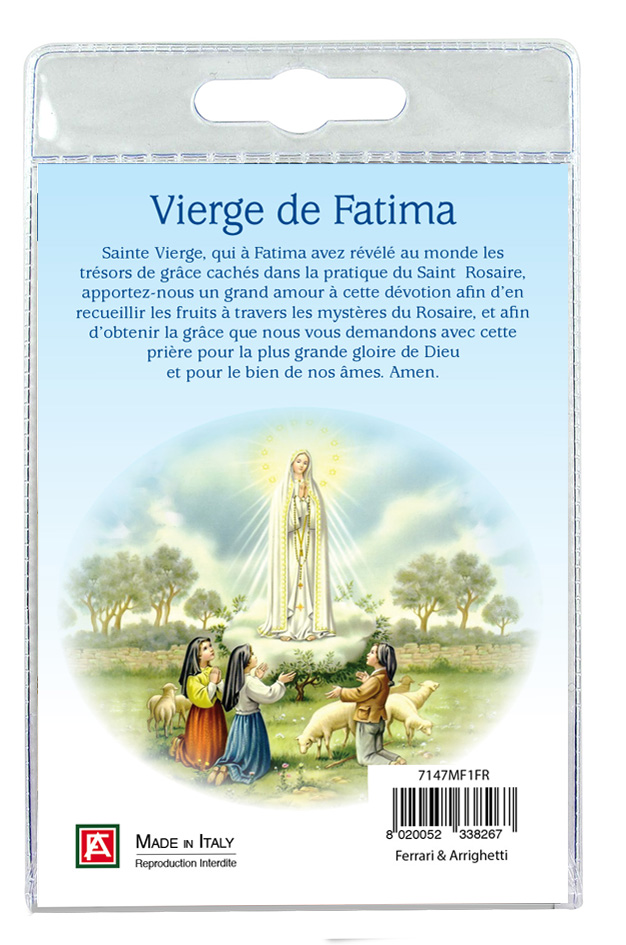 Il blister si presenta con all'interno un cartoncino, rappresentante la Madonna di Fatima.