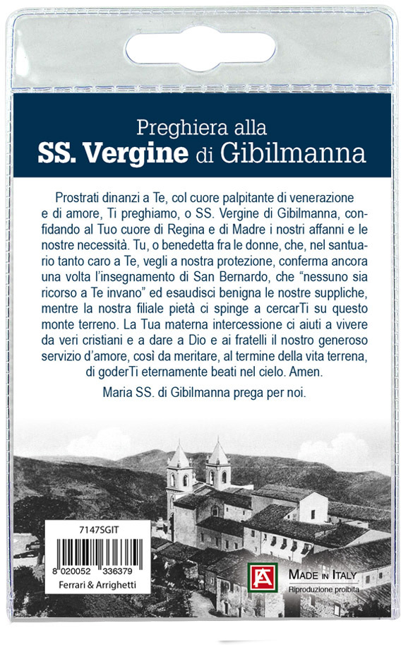 Il blister si presenta con all'interno un cartoncino, rappresentante la Madonna di Gibilmanna.