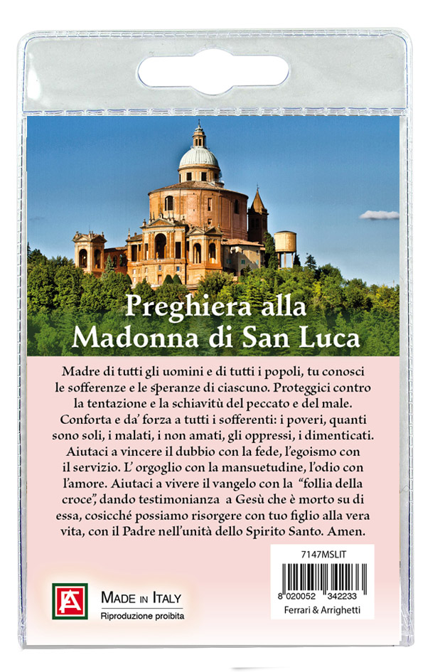 Il blister si presenta con all'interno un cartoncino, rappresentante la Madonna di San Luca