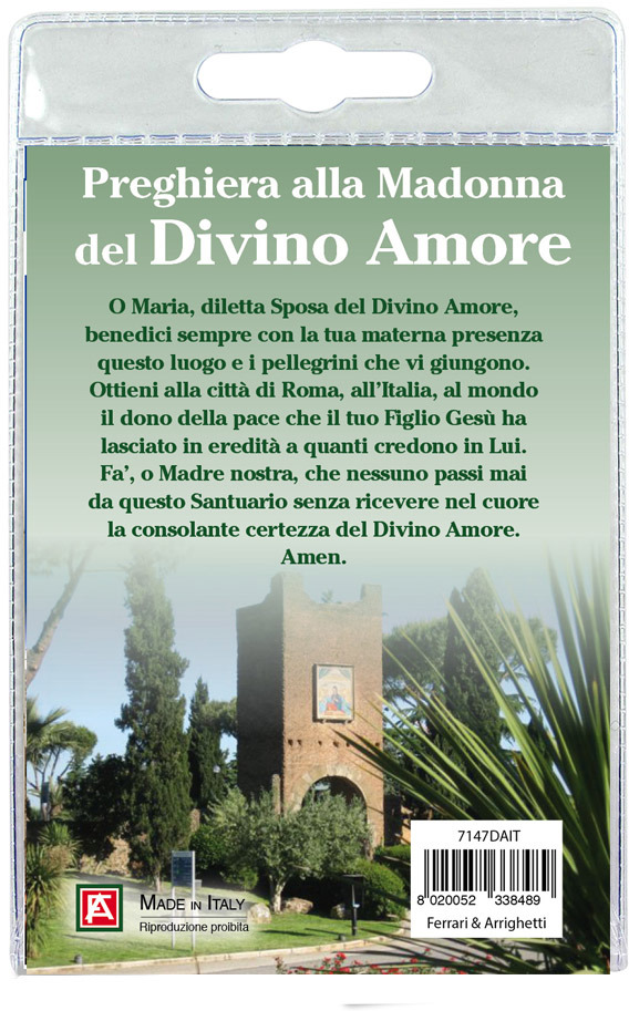 Il blister si presenta con all'interno un cartoncino, rappresentante la Madonna Divino Amore.