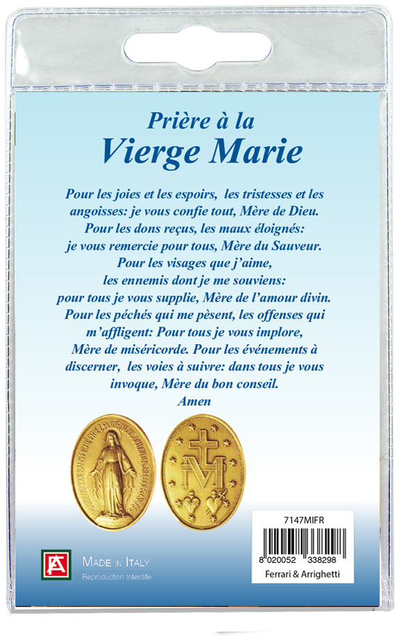 Il blister si presenta con all'interno un cartoncino, rappresentante la Madonna Miracolosa.