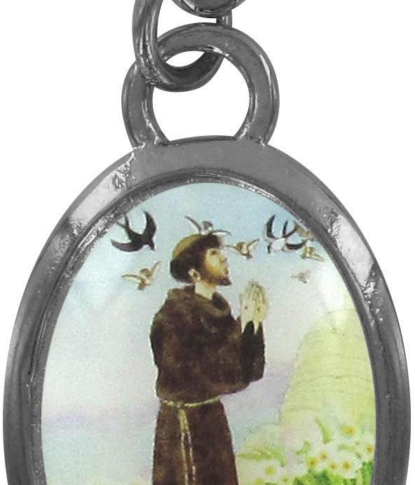 Il portachiavi è in metallo nichelato con l'immagine di San Francesco d'Assisi. Si compone di un anello dove si possono infilare le chiavi, abbellito da una immaginetta ovale pendente.