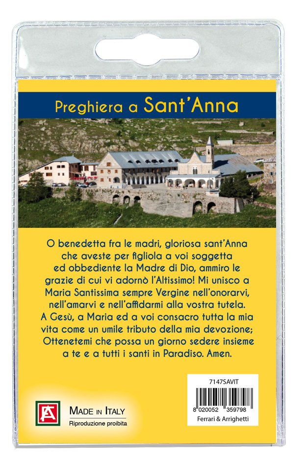 Sul retro del cartoncino vi è stampata una preghiera in Italiano dedicata a Sant'Anna.